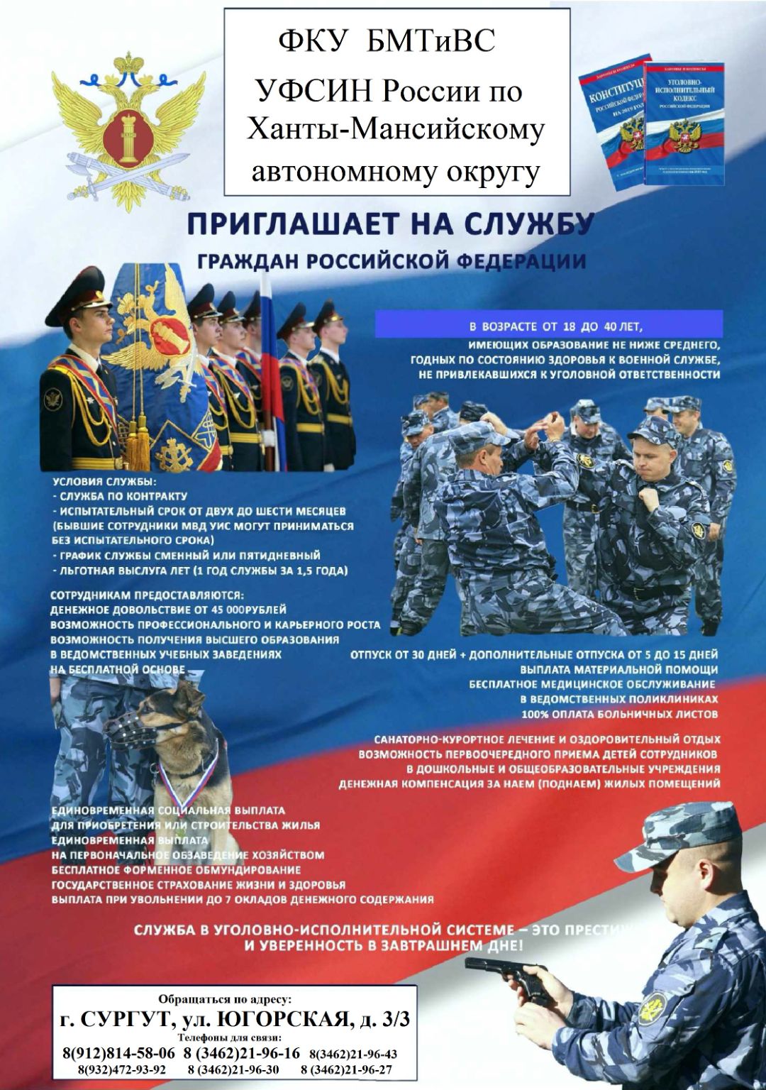 8-912-814-58-06, более подробная информация на сайте ФСИН России https://fsin.gov.ru/ и сайте УФСИН России по ХМАО – Югре https://86.fsin.gov.ru/ обращаться в ФКУ БМТиВС УФСИН России по Ханты-Мансийскому автономному округу – Югре по адресу: г. Сургут, ул. Югорская, 3/3, тел. (3462) 21-96-16, 21-96-43, 21-96-30 8-912-814-58-06,
